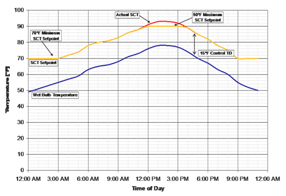 The following figure illustrates what the actual saturated condensing temperature and SCT setpoints could be over an example day using the wetbulb-following control strategy with a 15°F (8.3°C) TD and also observing the 70°F (21°C) minimum condensing temperature requirement. As the figure shows, the SCT setpoint is continuously reset to 15°F (8.3°C) above the ambient wetbulb temperature until the minimum SCT setpoint of 70°F is reached. The figure also shows a maximum SCT setpoint (in this example, 90°F (32.2°C), which may be used to limit the maximum control setpoint, regardless of the ambient temperature value or TD parameter.