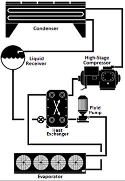 Standard practice is for published condenser ratings to assume the capacity of adiabatic condensers is proportional to the temperature difference (TD) between SCT and DBT for operation in dry mode, regardless of the actual ambient temperature entering the condenser. For example, the capacity of an adiabatic condenser operating at an SCT of 80°F with a DBT of 70°F is assumed to be equal to the same unit operating at 110°F SCT and 100°F DBT during dry mode operation, since the TD across the condenser is 10°F in both examples. Thus, similar to air-cooled condensers, the requirement for adiabatic condensers does not have varying sizing requirements for different design ambient temperatures.