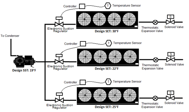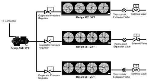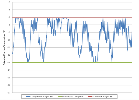 The minimum saturated condensing temperature setpoint must be 70°F (21°C) or less. For systems using halocarbon refrigerants with glide, the SCT setpoint shall correlate with a midpoint temperature (between the refrigerant bubble-point and dew point temperatures) of 70°F (21°C) or less. As a practical matter, a maximum SCT setpoint is also commonly employed to set an upper bound on the control setpoint in the event of a sensor failure and to force full condenser operation during peak ambient conditions. This value should be set high enough that it does not interfere with normal operation.