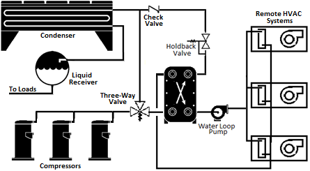 Condenser fans for new air-cooled, evaporative, or adiabatic condensers; or fans on air or water-cooled fluid coolers; or cooling towers used to reject heat on new refrigeration systems must be continuously variable-speed controlled. Variable-frequency drives are commonly used to provide continuously variable-speed control of condenser fans and controllers designed to vary the speed of electronically commutated motors are increasingly being used for the same purpose. All fans serving a common high side, or indirect condenser water loop, shall be controlled in unison. Thus, in normal operation, the fan speed of all fans within a single condenser or set of condensers serving a common high side should modulate together, rather than running fans at different speeds or staging fans off. However, when fan speed is at the minimum practical level, usually no higher than 10-20%, the fans may be staged off to reduce condenser capacity. As load increases, fans should be turned back on before significantly increasing fan speed, recognizing a control band is necessary to avoid excessive fan cycling. Control of air-cooled condensers may also keep fans running and use a holdback valve on the condenser outlet to maintain the minimum condensing temperature. Once all fans have reached minimum speed, the holdback valve is set below the fan control minimum saturated condensing temperature setpoint.