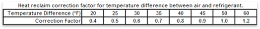 Finally, the designer needs to know the temperature difference between the condensing temperature (inside the recovery coil) and the temperature of the air entering the recovery coil. Since the coil will be installed in an air-handling unit downstream of the outside air damper, the designer assumes that the air entering the coil is a mix of return air from the store and outside air. The designer must determine an appropriate design temperature for the air entering the recovery coil (entering air temperature or EAT) during average heating hours, which in this instance was determined to be 65°F. From the example, the heat recovery system will have a holdback valve setting of 95°F SCT. Therefore, the temperature difference is: