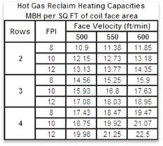 Using the face velocity, design coil capacity, and temperature difference between condensing temperature and entering air temperature, the designer then refers to the air-handling unit catalog to select a recovery coil. Then the designer uses the following two tables: