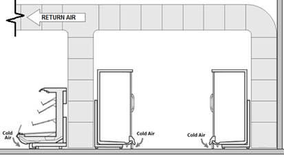In supermarkets, ducting return air from behind display cases or near the floor is beneficial in improving comfort by removing the stagnant cool air that naturally occurs due to product refrigeration cases. This approach also increases the effectiveness of refrigeration heat recovery by increasing the temperature difference between the return air temperature and the refrigerant condensing temperature in the heat recovery coil. Figure 10-24 shows the location of an HVAC return air duct positioned to scavenge cool air from the floor level near refrigerated display cases.