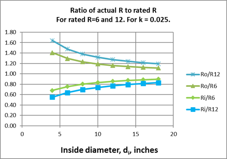 Consider one duct of constant inside diameter, di, and length L. The duct is insulated with insulation having a thermal conductivity k, and rated R value, Rrate. All R values herein are in the units of (hr-ft2-F/Btu).