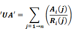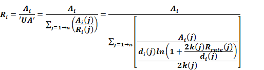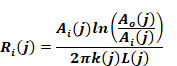 The duct branches, j=1à n, are combined, each of inside areas Ai(j), outside areas Ao(j), conductivities k(j), and inside area based resistances Ri(j). Using the method of Palmiter and Kruse (2003), the overall conductance of the branched duct system, based on inside area, is the sum of the conductances of each branch: