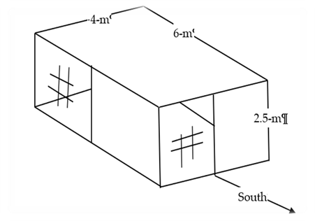 Carroll (1981) compared his model, and other simplified models, with the exact solution for the enclosure shown in Figure 10. Half the south wall and half of the west wall are glass with ε = 0.84, and the rest of the interior surfaces have ε = 0.9.