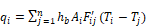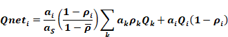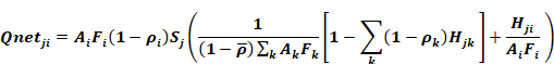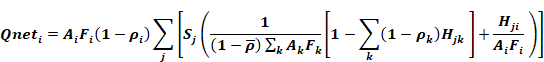 The total net heat transfer from surface i (i.e., the radiosity minus the irradiation for the un-linearized circuit) is given by summing Equation 85 for all the surfaces seen by surface i: