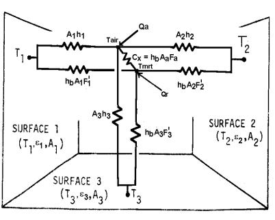 It is an approximate model that simplifies the “exact” network (see Appendix C) by using a mean radiant temperature node, Tr, that act as a clearinghouse for the radiation heat exchange between surfaces, much as does the single air temperature node for the simple convective heat transfer models. For n surfaces this reduces the number of circuit elements from (n-1)! in the exact case, to n with the Carroll model.