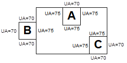 The accompanying sketch shows a building with three unconditioned spaces (none has a direct source of mechanical heating or cooling). The air transfer rate from the adjacent conditioned spaces is less than three air changes per hour. The area weighted heat transfer coefficients of the walls (UA) are shown on the sketch. The roof/ceiling area weighted heat transfer coefficients (UA) for each of the three unconditioned spaces is 90 Btu/hr -°F.