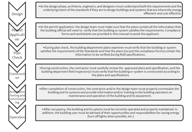 The Energy Standards specify detailed reporting requirements that are intended to provide design, construction, and enforcement parties with information needed to complete the building process and ensure that the energy features are installed. Each party is accountable for ensuring that the building’s energy features applicable to their area of responsibility are installed correctly. This section outlines and discusses the responsibilities and requirements during each phase of compliance and enforcement. (See Figure 2-1.)