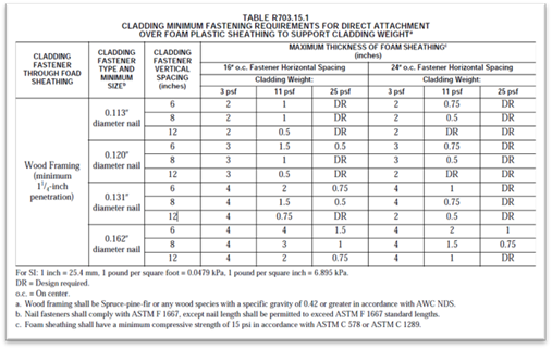 The 2019 California Building Code (CBC) provides guidance on fastener penetration depth, diameter, and spacing for exterior foam sheathing in Section R703.11.2. CRC Table 703.15.1, reproduced below in Figure 3-20, shows the fastener spacing for cladding attachment over foam sheathing to wood framing.
