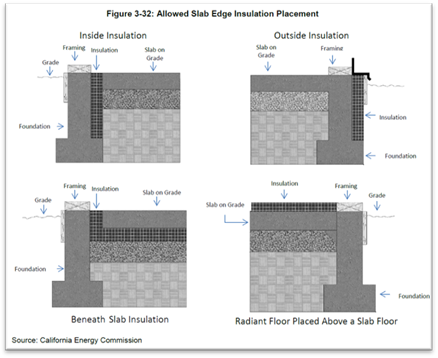 One option is to install the insulation between the heated slab and foundation wall. In this case, insulation must extend downward to the top of the footing and then extend horizontally inward four feet toward the center of the slab. R-5 vertical insulation is required in all climates except Climate Zone 16, which requires R-10 of vertical insulation and R-7 horizontal insulation.