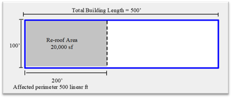 The ratio of the replaced roof to the affected wall area is 20,000 ft² / 500 linear ft = 40:1. Since this ratio is greater than 25:1, the full required insulation must be installed regardless of the existing base flashing height. This may require changing the height of the base flashing, removing some of the parapet wall cladding and moving the counterflashing higher up on the wall. Alternatively, the installer may ask for the roofing manufacturer to provide a variance in the warranty to accept a slightly lower base flashing height above the roof surface. The specific risk of roof leakage at a given site has to be considered carefully before reducing the base flashing height. When access to the underside of the roof deck is available, an alternative method of compliance that does not affect base flashing heights is to add insulation below the roof deck to meet the U-factor.
