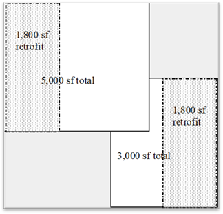 No. The 1,800 ft² retrofit is 36 percent of the 5,000 ft² roof. Thus, the 1,800 ft² retrofit is less than 50 percent of the roof area and it is less than 2,000 ft²; thus, it is not required to comply with the insulation and cool roof requirements in §141.0(b)2B.