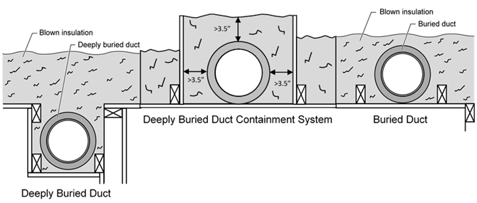 Deeply buried containment systems must be installed such that the walls of the system are at least 7 inches wider than the duct diameter (3.5-inch clearance on each side of duct) extend at least 3.5 inches above the duct outer jacket, and the containment area surrounding the duct must be completely filled with blown insulation.