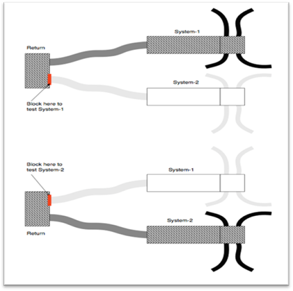 If there are two or more duct systems in a building that are tied together at a common return duct, then each duct system should be tested separately, including the shared portion of the return duct system which should be included in each system test. Under this scenario, the portions of the second duct system that is not being tested must be completely isolated from the portions of the ducts that are being tested, so the leakage from the second duct system does not affect the leakage rate from the side that is being tested.