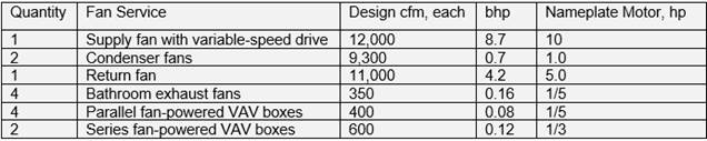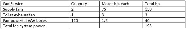 A variable-volume air handler serving a lab system has a fan system design supply airflow of 10,000 cfm. The supply fan has a 20 hp (nameplate) supply fan motor that operates at an input power of 13.9 bhp. The exhaust fan has a five hp motor that operates at an input power of 3.20 bhp. Flow control devices in the exhaust are used to maintain pressure relationships between spaces served by the system.