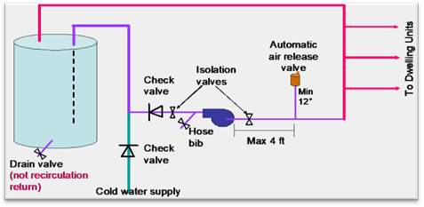 To meet the pump priming equipment requirement, a hose bib must be installed between the pump and the water heater. In addition, an isolation valve shall be installed between the hose bib and the water heating equipment. This configuration will allow the flow from the water heater to be shut off, allowing the hose bib to be used for bleeding air out of the pump after replacement.