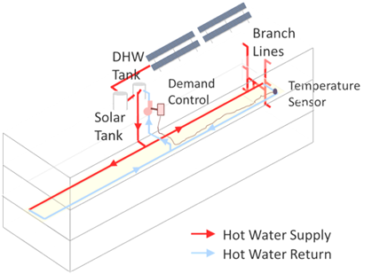 Figure 4-32 provides an example of how to implement dual-loop design in a low-rise multi-family building with a simple layout. In this example, the water heating equipment is located in the middle of the top floor with each recirculation loop serving exactly half of the building. The recirculation loops are located in the middle floor to minimize branch pipe length to each of the dwelling units. Figure 4-32 also illustrates how the solar water heating system and demand control are integrated.