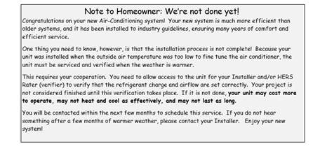 2. Wait for warmer temperatures and perform the standard charge verification procedure. In this case, the installer must agree to return to correct refrigerant charge if a HERS Rater determines later, when the outside temperature is 55 degrees F or above, that correction is necessary as described in Residential Appendix RA 2.4.4. The installer must also provide written notice to the homeowner that the charge has not yet been verified. An example homeowner’s notification is shown in Figure 4-46.