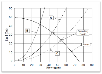 All pool pumps sold in California must be tested and listed with the Energy Commission according to the Appliance Efficiency Regulations. Pump manufacturers must list flow rate, power, and energy factor at each of three system curves. (See Figure 5-17) For pools equal to or less than 17,000 gallons, a pump must be chosen such that the flow rate listed for Curve A is less than the 6-hour turnover rate. For pools greater than 17,000 gallons, a pump must be chosen such that the listed flow rate at Curve C is less than the 6-hour turnover rate.