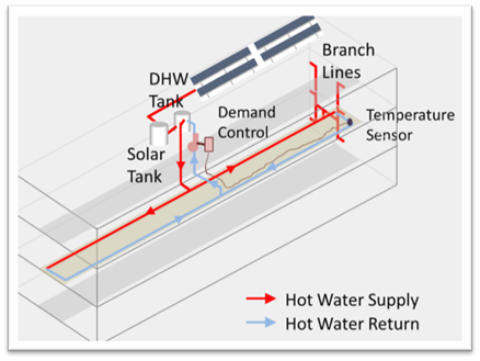 The prescriptive requirement for domestic hot water systems serving multiple dwelling units requires the installation of a demand recirculation control to minimize pump operation and heat loss from pipes. They are different from the demand controls used in single dwelling units. Demand controls for central recirculation systems operate by sensing hot water demand and recirculation return temperatures. The temperature sensor should be installed at the farthest end of the recirculation loop close to the last branch pipe.
