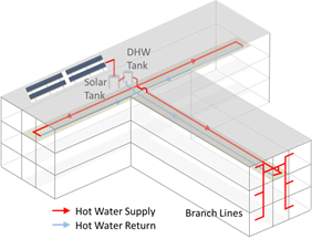 Figure 5-7 provides an example of how to implement dual loop design in a low-rise multifamily building with a simple layout. In this example, the water heating equipment is in the middle of the top floor with each recirculation loop serving exactly half of the building. The recirculation loops are located in the middle floor to minimize branch pipe length to each dwelling unit. The figure also illustrates how the solar water heating system and demand controls are integrated.