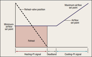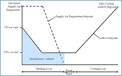 Source: Taylor Engineering Dual Maximum: Raises the supply air temperature (SAT) as the first stage of heating, and increases the airflow to the zone as the second stage of heating. 1. The first stage of heating consists of modulating the zone supply air temperature setpoint up to a maximum setpoint no larger than 95°F while the airflow is maintained at the dead band flow rate. 2. The second stage of heating consists of modulating the airflow rate from the dead band flow rate up to the heating maximum flow rate (50 percent of design flow rate).
