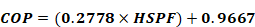 The heating efficiency of a heat pump at AHRI rated conditions as a dimensionless ratio of output over input. The software must accommodate user input of either the coefficient of performance (COP) or the heating season performance factor (HSPF). Where HSPF is provided, COP shall be calculated as: