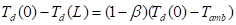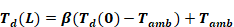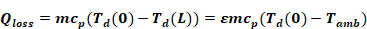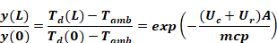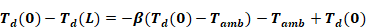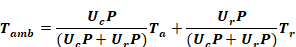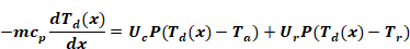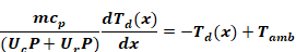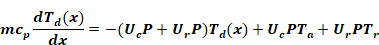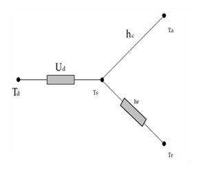 Heat transfer through the duct walls can be illustrated in the electrical analogy in Figure A-1. The first node on the left represents the temperature of the air in the duct (Td) and is connected to the temperate on the surface of the duct (Ts) by the conductance through the duct wall (Ud). The convective heat transfer coefficient (hc) connects the surface temperature to the duct zone air temperature (Ta). The radiation heat transfer coefficient (hr) connects the surface temperature to the duct zone radiant temperature (Tr).