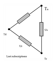 The temperatures of the duct zone are assumed to be constant; the duct surface temperature is not. The duct surface temperature can be removed from the analysis by using a Y-Δ transform. Figure A-2 shows the result of this transformation with direct connections between the duct air temperature, the duct zone radiant and air temperatures through combined coefficients defined in Equation A-1.