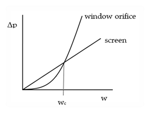 Figure B-2 shows that the typical Δp vs. flow curves for a screen and an orifice separately, not in series. The curves cross at velocity wc . To the left of wc, the laminar flow pressure drop dominates the window orifice pressure drop; to the right the orifice pressure drop progressively dominates. Screens give a greater flow reduction at low wind speeds than at high wind speeds.