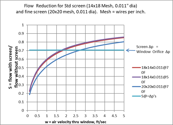 where S is the ratio of the flow with a screen to the flow rate without a screen, as a function of velocity w, viscosity, and screen and window orifice parameters.