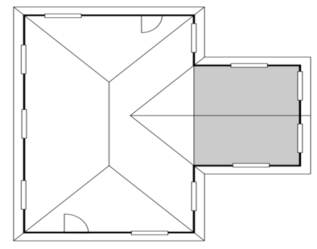 Consider the house in Figure G-1 in climate zone 12. The shaded area is the addition. Some windows and walls are removed to build the addition. These are ignored. The existing home has the following features: