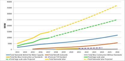 The expected increase in PV installations due to the 2019 Standards PV requirement is equal to only 1.1 percent of total existing statewide PV capacity. The other 98.9 percent of the PV capacity installed in the state–including utility-scale PV systems, nonresidential buildings installations, and PV installed on existing homes–is unaffected by the new requirements. Further, because the rate of growth for utility-scale and voluntary, behind-the-meter capacities is steeper than the residential new construction rate, residential new construction will make up a smaller percentage of total statewide PV capacity in the future.