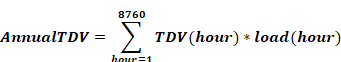 EDR scores are based on the total annual-TDV of a design relative to the total annual-TDV of the reference design. Annual-TDV is the sum across hours of the net energy used in that hour multiplied by that hour’s TDV.