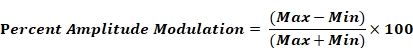 Calculate percent amplitude modulation (percent flicker) of unfiltered data over the duration of the test for a given dimming level using the following equation: