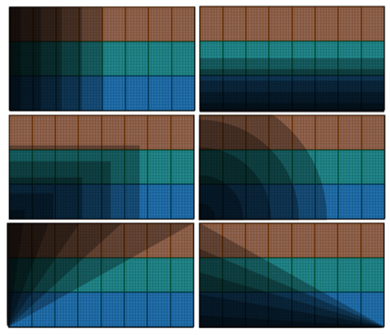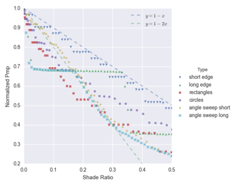 In this study the same module was shaded in different fashions (see first figure). For a given shade ratio, the actual output from the PV system can differ by 30% depending on which portions of the system are shaded (Note: the dotted lines in the first figure represent SIF values of 1.0 [y = 1 – 1.0*x] and 2.0 [y = 1 – 2.0*x] and serve as approximate bounds on the impact). Without cell-level fidelity in our shading model, it is impossible to know which specific cells are shaded at any given time. The compliance software will use a coarse approximation of SIF appropriate for panel and/or array level analysis.