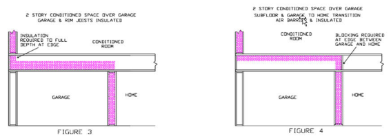 The separation between conditioned space (house) and the garage shall be insulated by spraying SPF insulation to create a continuous thermal barrier. All rim and band joists adjoining conditioned space shall be air tight and insulated.